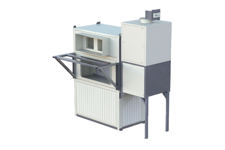 - Specify make-up air duct flange, air discharge direction, side for pressure blower installation, and power required.