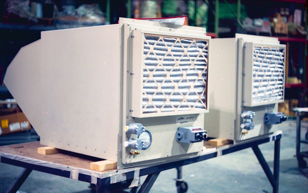 All PBX 10 Series models are pre-assembled and pretested. Included are adjustable pressure set controls, Magnehelic gage pressure readout, and start/stop controls. Pressure maintenance is fully automatic. Any previous requirement for high maintenance barometric damper controls is eliminated. Room pressure can be preset and displayed anywhere in the range of 0.025″ to 0.20″ w.c. . A Vari-Speed controlled pressure blower provides air flow up to 2600 cfm and continuously maintains the preset room pressure. With entrance doors closed, the air flow is precisely modulated to offset air losses from building leakage. When a door is opened, the air flow immediately increases to provide the 60 fpm minimum velocity through the opening as required by code. The available makeup air is sufficient to service rooms and buildings that have one or two access doors. Applications that require simultaneous air conditioning, higher air volumes, high external static pressures or special air filters can be met with Series PB(X) 15, PB(X) 20 or PB(X) 24 equipment.