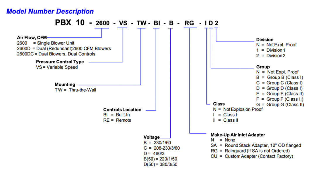 2. Determine the PBX 10 Series model number using the description shown. For applications requiring air flow greater than 2600 CFM use Series PBX 15 or PBX 20.