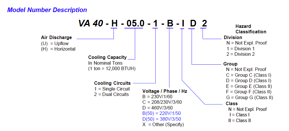 - For ‘explosion proof’ models, determine hazard classification per National Electric Code. For example: Class I, Group D, Division 2. For models with combined pressurization and air conditioning, request bulletin AIPR3PSS.